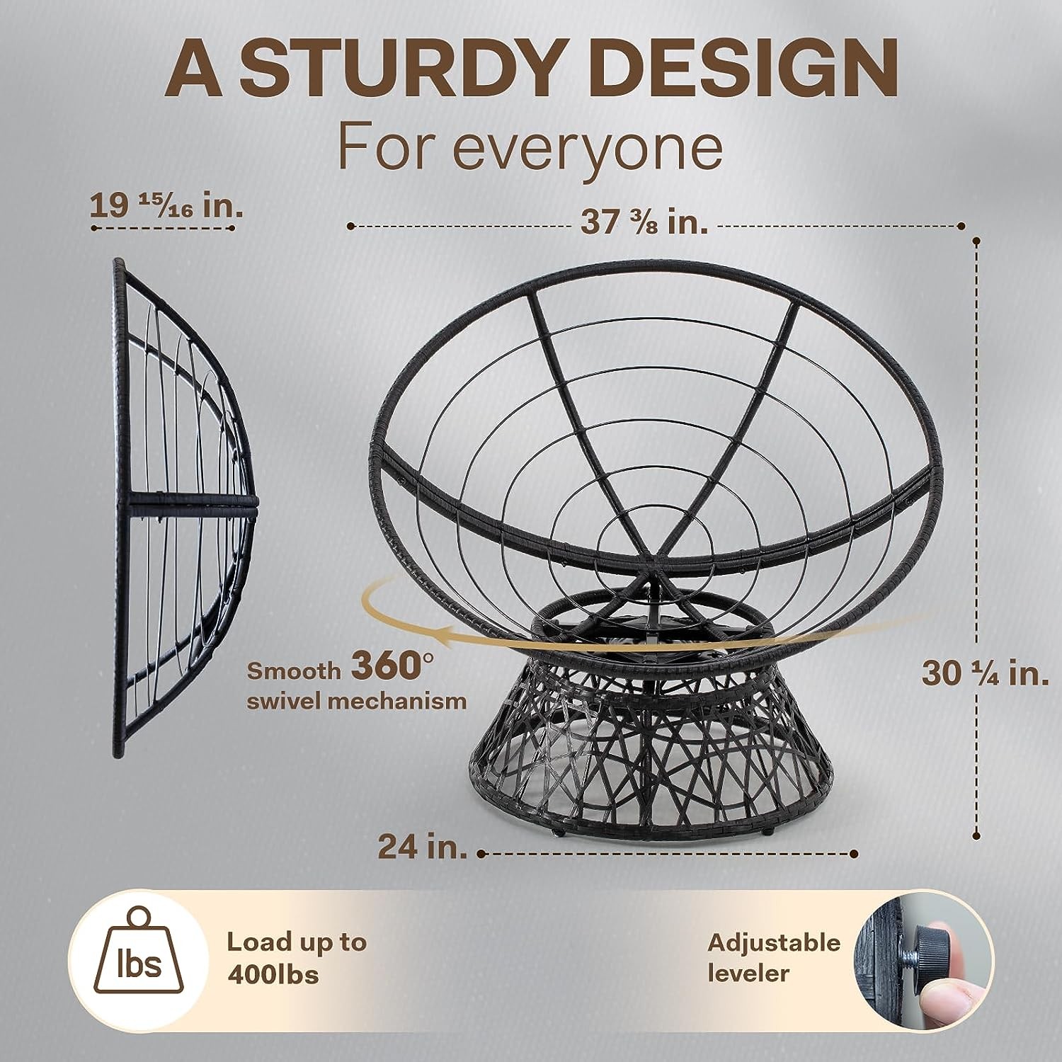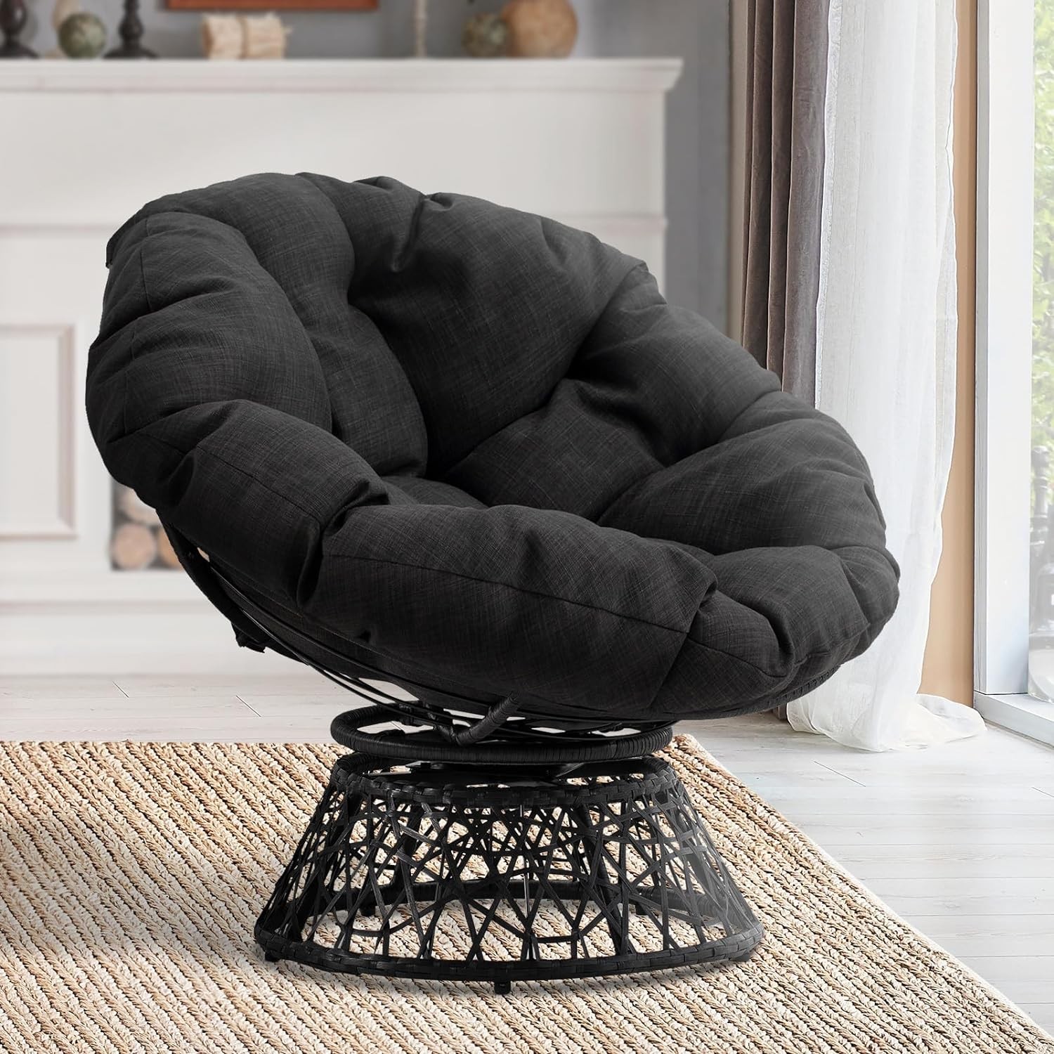 • 360 DEGREE SWIVEL PAPASAN CHAIR: The papasan chair frame is made of solid metal and expertly woven resin wicker; 360 degree swivel papasan chair base has a smoothly rotating structure without noises and friction; Five levelers protect your floor and are easily adjustable for stability of wicker papasan chair
