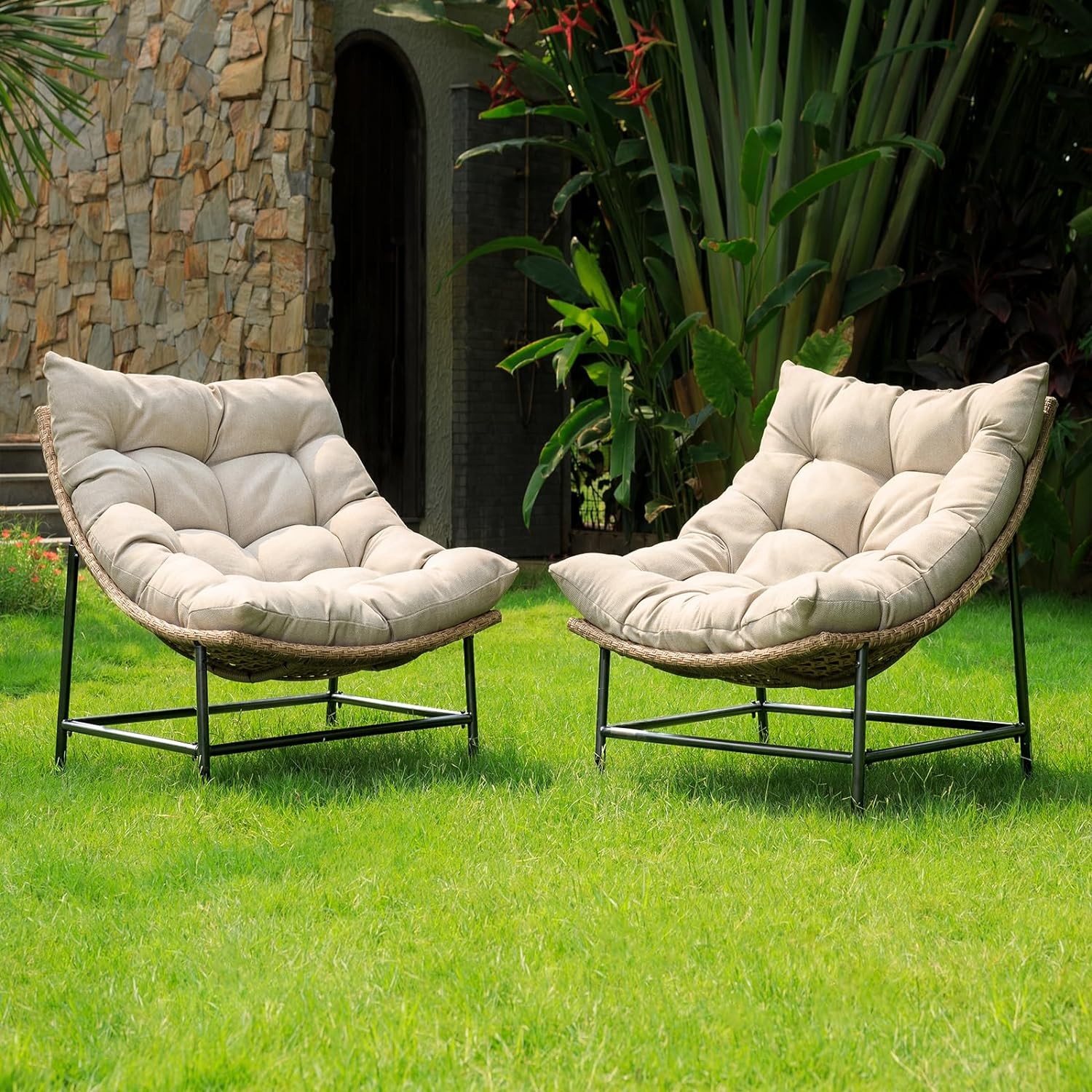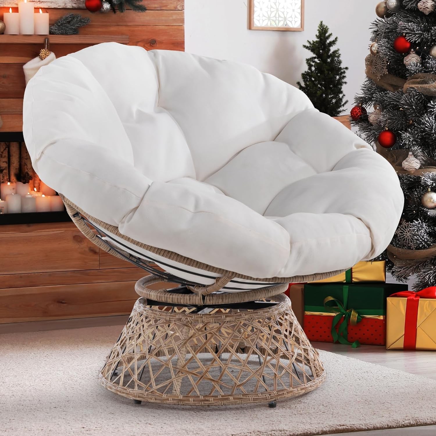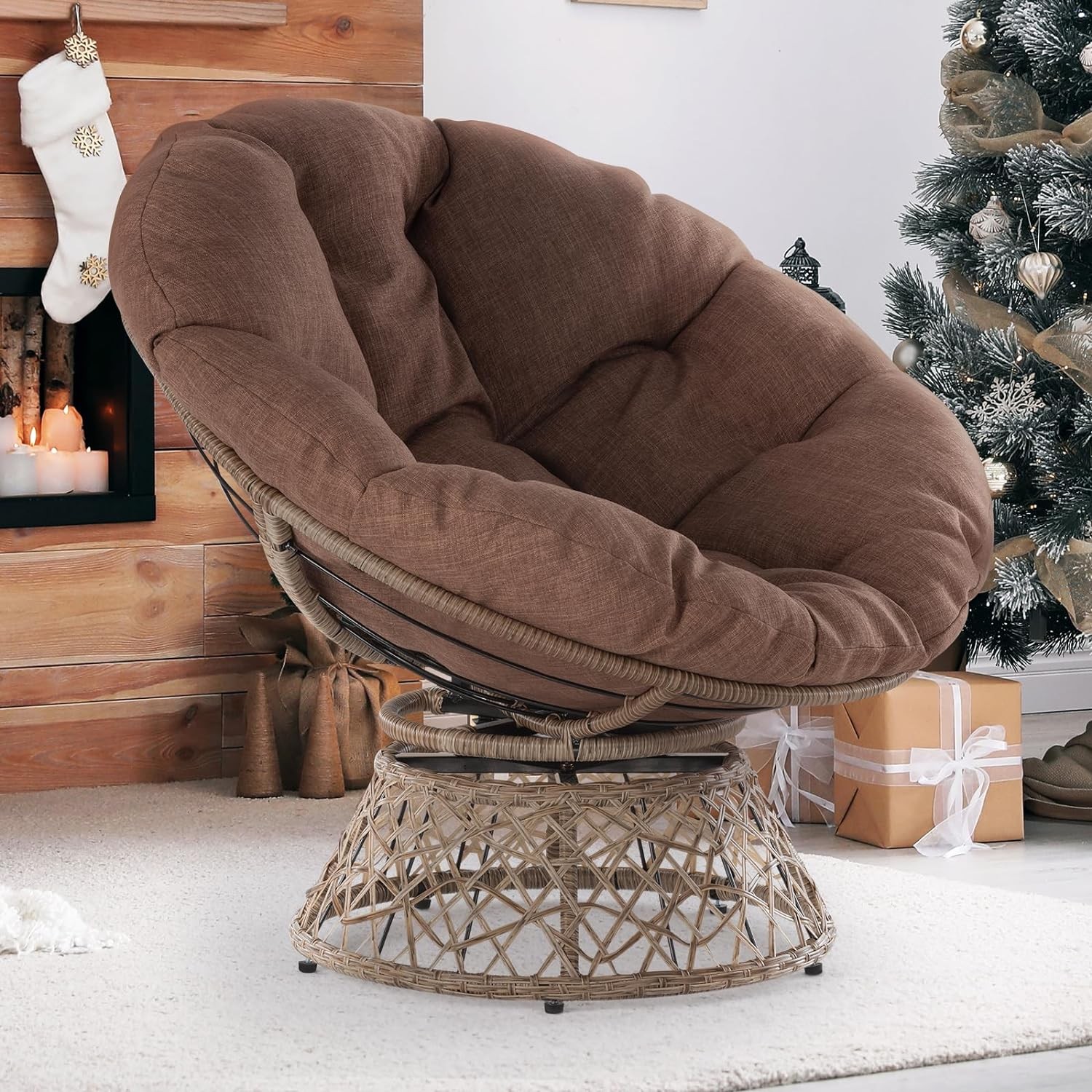 • HEAVENLY COMFORT WITH PLUMP CUSHION: Our upgraded papasan chair cushion has 9.48 pounds of extra padding fiber, 6 3/4 inches thickness, plus an airy TC inner fabric for added comfort and coziness; Three straps secure the large papasan cushion on the round wicker chair frame, preventing it from slipping away; The cushion should be shaken and fluffed up regularly to maintain the shape