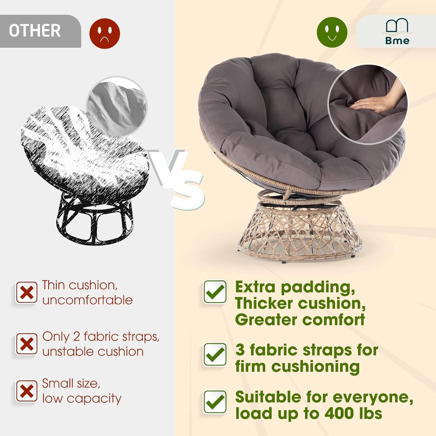 The papasan chair frame is constructed of solid metal can support up to 400 pounds of weight and expertly hand-woven resin wicker, making it both beautiful and durable. (Fit for all ages).