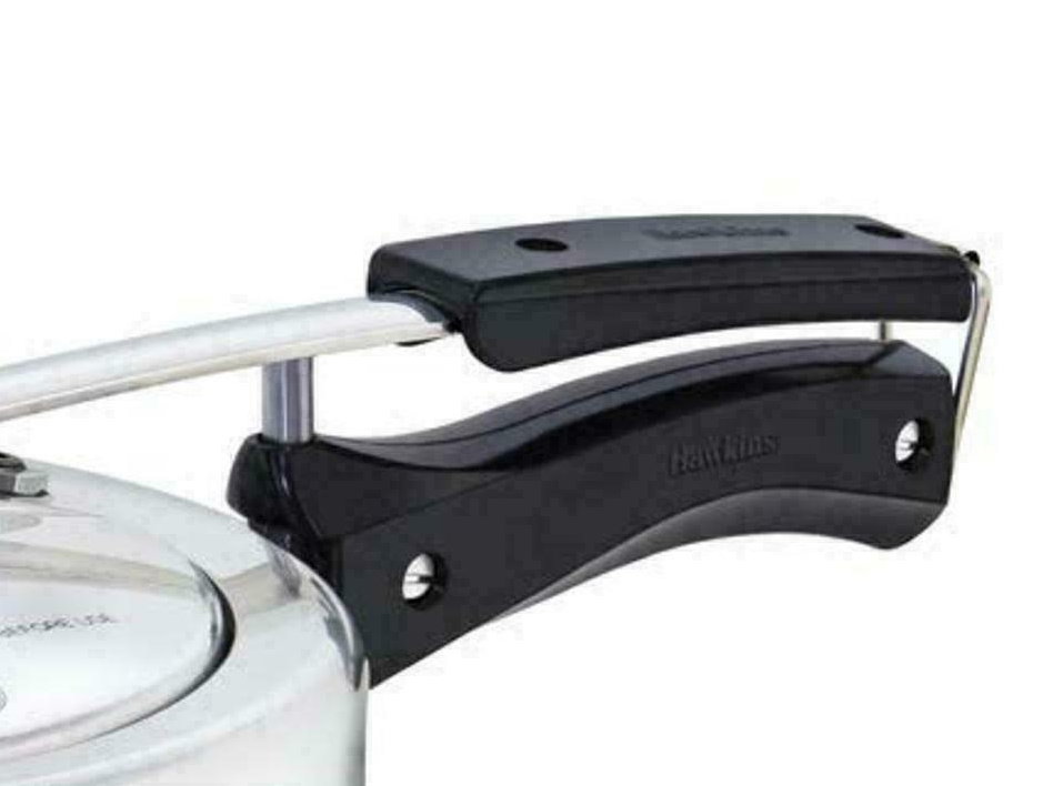 The Hawkins Hevibase pressure cooker made of commercially available pure aluminum is induction compatible with an external base plate made of Aisi 430 grade magnetic stainless steel, which is attached to the double-thick base. It can be used safely on all household gas, electric, halogen, ceramic and induction hobs. The double-thick, heavy base is ideal for lightly frying before pressure cooking. The base stays flat, never bulges. Suitable for gas, electric, ceramic and halogen hobs. A version of this model with a fully hard anodized, double-thickness base was available as the Hawkins Ecobase. This was suitable for household gas, electricity, halogen, ceramics, but not induction hobs. This product is no longer available in certain markets.