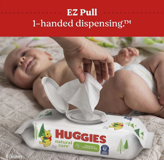 Huggies Natural Care Sensitive Baby Wipes are plant-based wipes, made with 99% purified water and 1% skin essential ingredients for a gentle clean. Infused with aloe & vitamin E, the unique base sheet locks-in and absorbs the mess to help keep baby's skin clean and moisturized. Safe for sensitive skin with no harsh ingredients, Huggies Natural Care unscented diaper wipes are hypoallergenic, dermatologically tested and pH-balanced to help maintain healthy skin. The wipes are fragrance free, alcoholFree, parabenFree and do not contain phenoxyethanol or MIT, earning these diaper wipes the National Eczema Association’s seal of approval. Huggies Natural Care unscented baby wipes are extra soft & gentle, making them ideal for sensitive newborn skin. Plus, with EZ Pull 1-Handed Dispensing, it is easy to grab wipes without wasting sheets! With the #1 branded wipe* you can feel confident you are giving baby a safe, gentle clean every time.