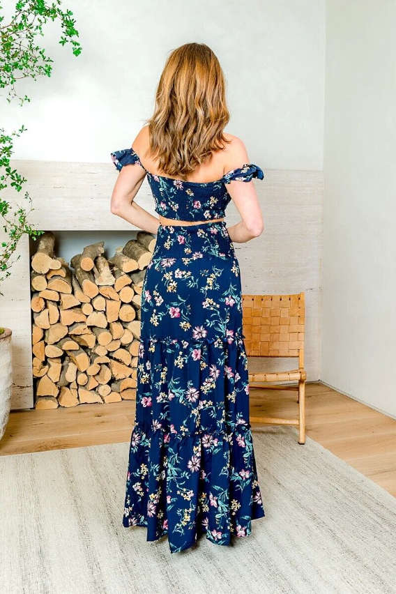 Navy Blue Floral Maxi Skirt Set Size Medium Crop Top Smocked