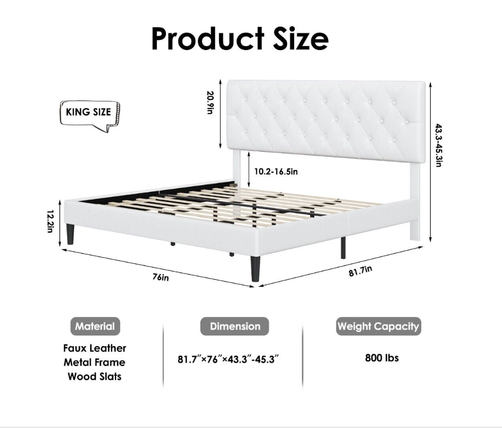 King Size Leather Low Profile Sleigh Platform Bed Frame with Headboard,White